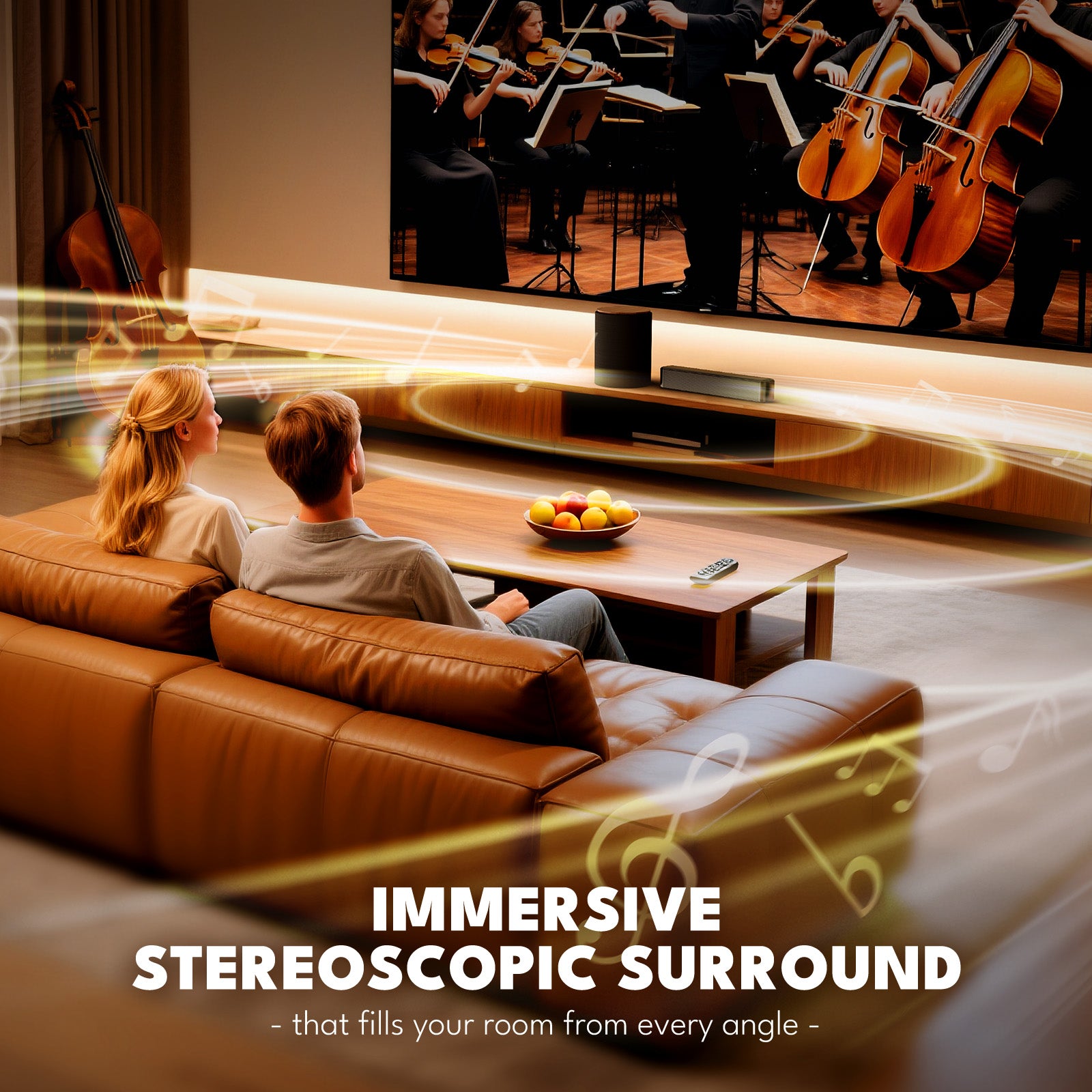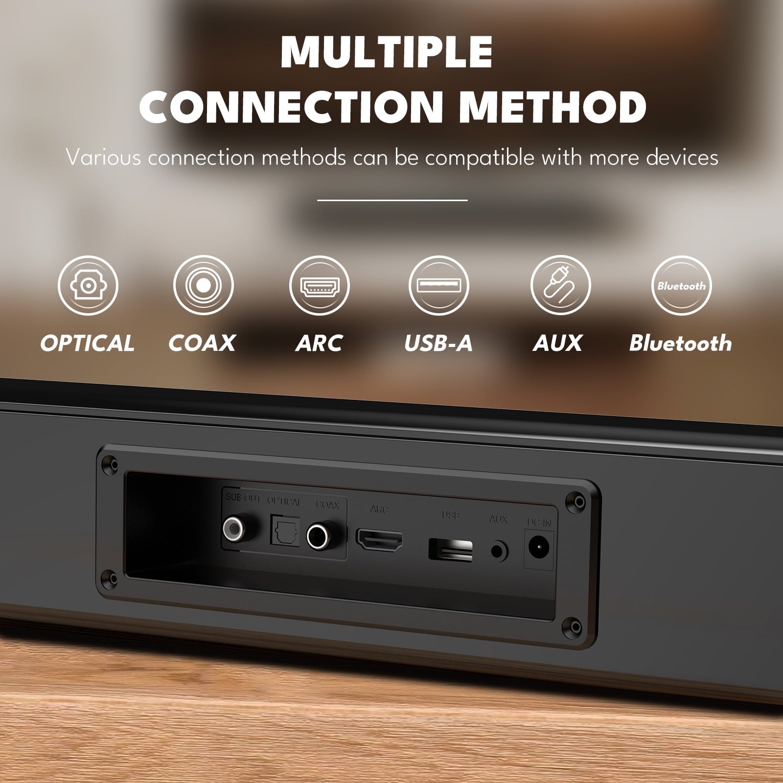 This is a small and powerful 2.1 Channel Bluetooth 5.4 Sound Bar for TV with a stylish appearance and excellent audio response. The 60W sound bar has 2 built-in speakers and 1 dedicated subwoofer, which can provide clear sound over a wide frequency range, completely exceeding the sound effects displayed by its volume. With crisp high notes and deep low notes, KIVDIT Sound Bar can deliver home theater-level sound quality for you. The built-in USB port can directly play MP3/WAV files from compatible media and provides more flexible input options, including AUX, ARC, Optical, Coaxial and Bluetooth.