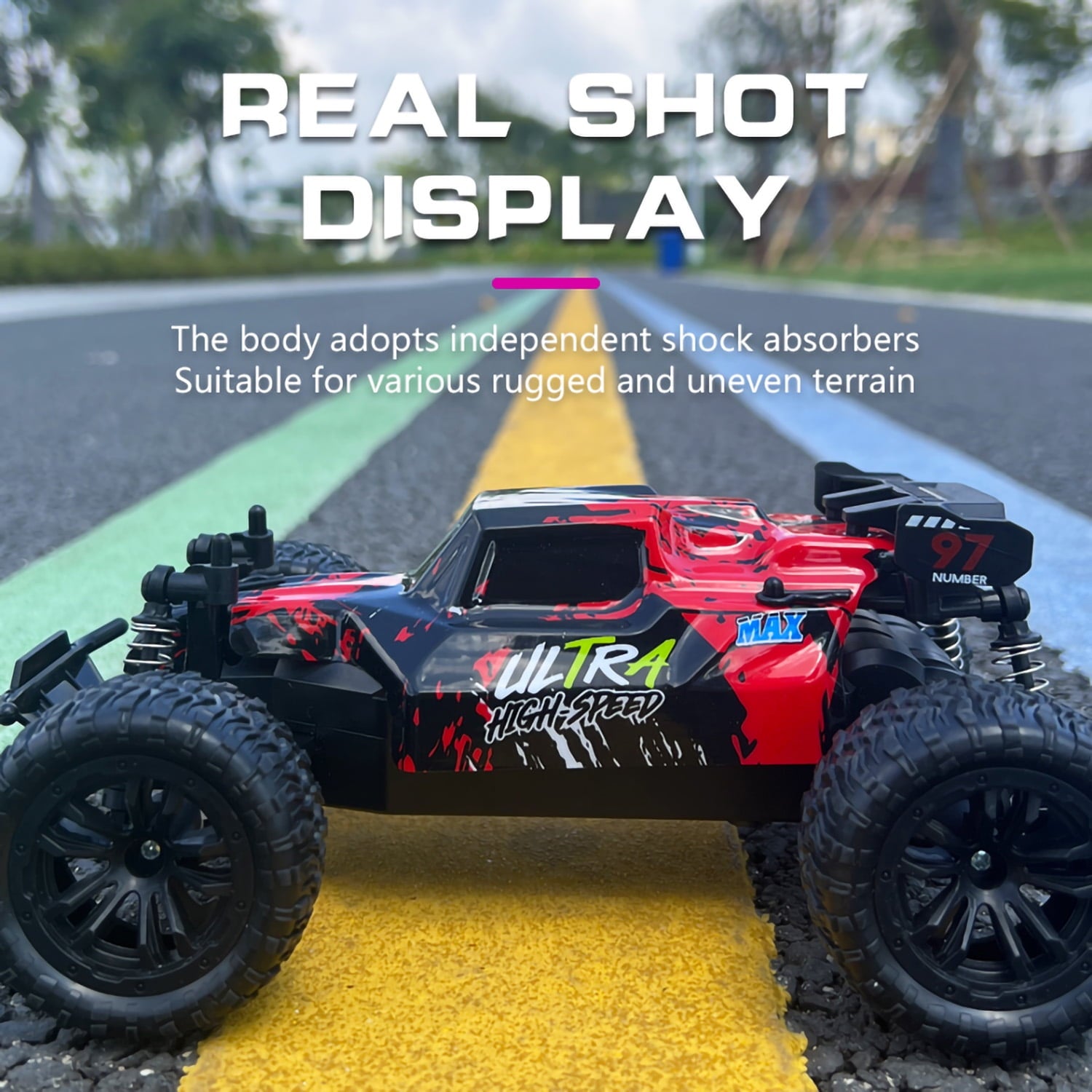 - 【Excellent Shock Absorption Design】-1:18 rc car has four robust composite tread tyres with excellent adhesion, rear wheel drive, a front suspension and a suspension with shock absorbers on the back, which makes it easier to overcome uneven roads. The RC Truck with low centre of gravity and rear wing design also allow fast driving.