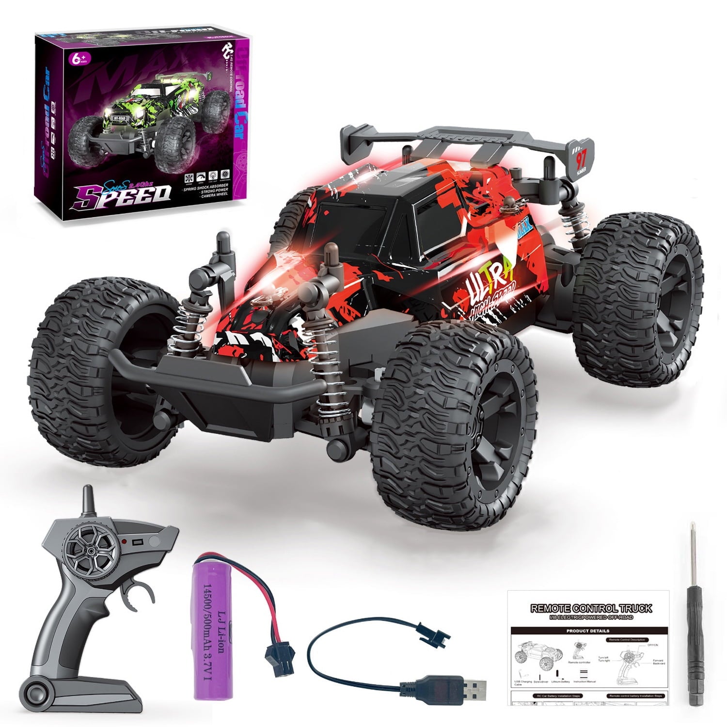 Kivdit 1:18 High Speed Remote Control Car with Crash protection bumper, Fine tuning of the steering lever, Metal shock absorber, and Non-slip rubber tires. The body is made of thick material, which is strong and can withstand the impact test. The oversized tires make it easy for the truck to cross-country race on most terrain. Enjoy interactive competitions with family and friends and make the game even more fun.