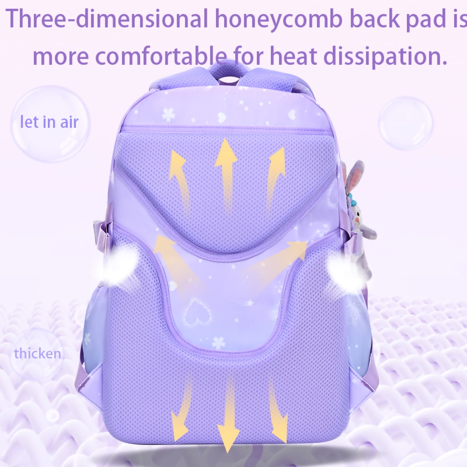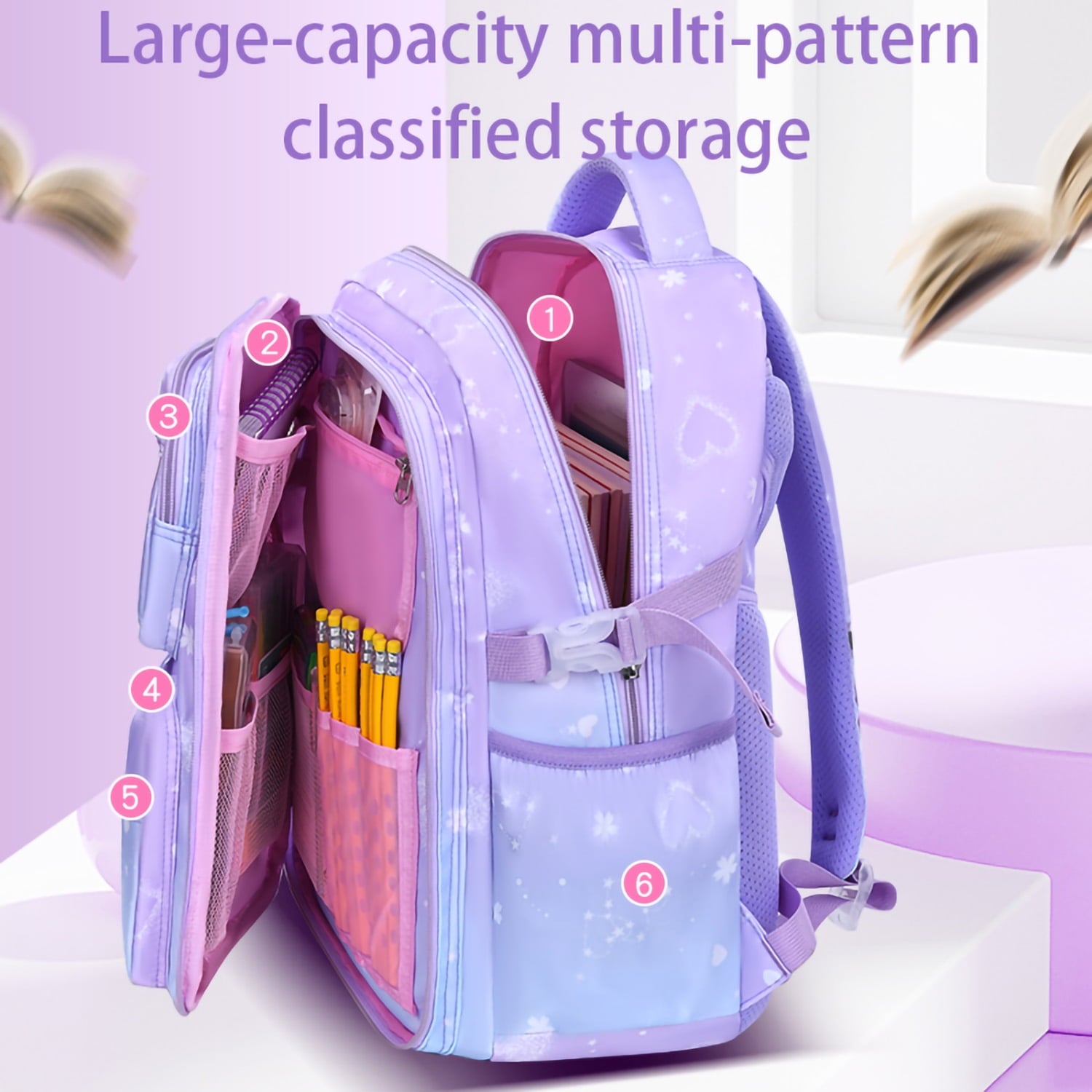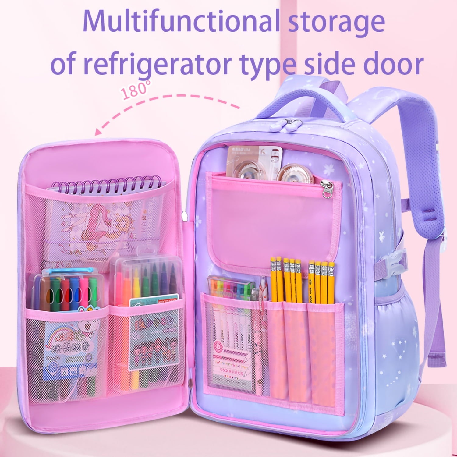 This purple girls backpack features a large capacity, perfect for carrying all your essentials, whether for school, work, or travel. Its durable construction ensures long-lasting use.