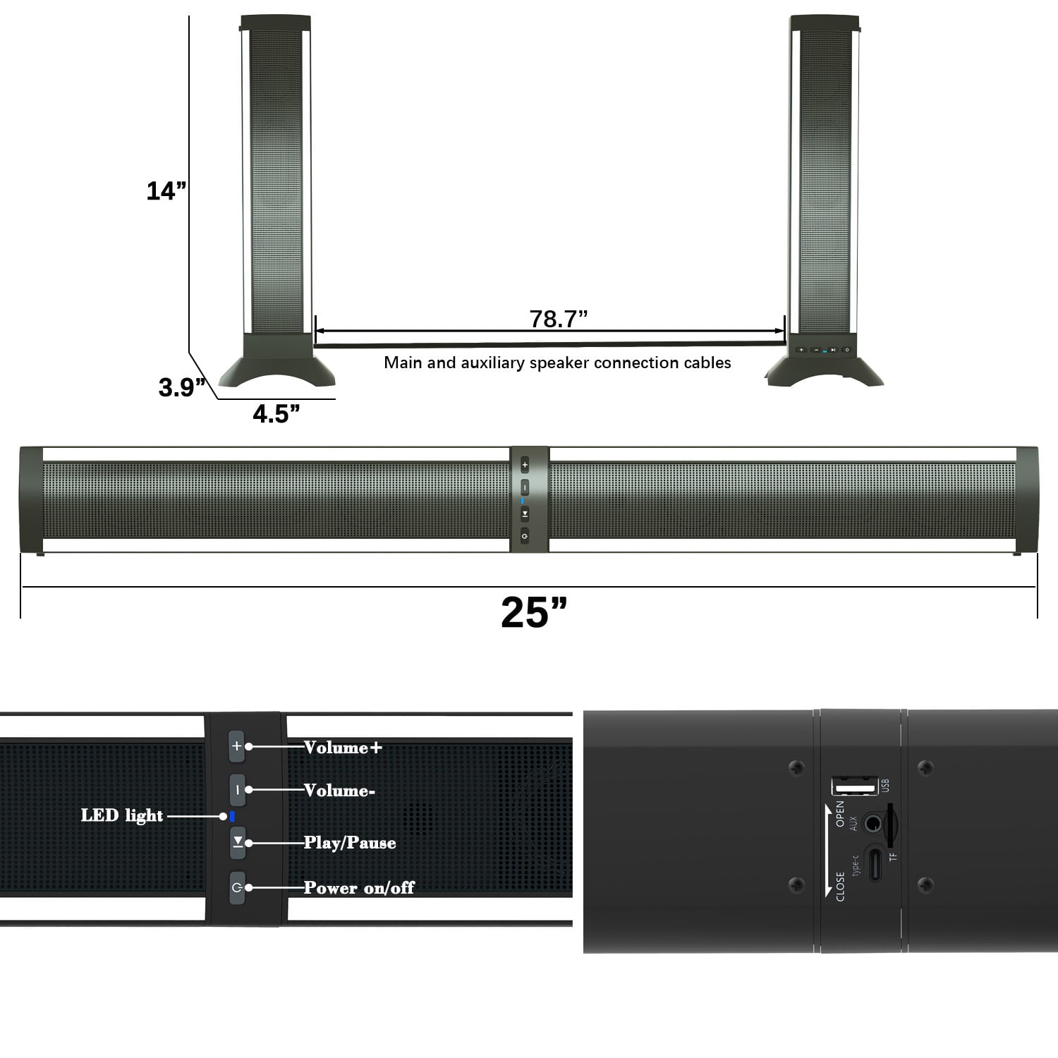 This soundbar is detachable which is very convenient for your moving, outdoor parties and RV travel.Main speaker and Auxiliary speaker can easy to assemble and disassemble.The soundbar is only 14 inches in the box when packed in a box which is easy to carry around.